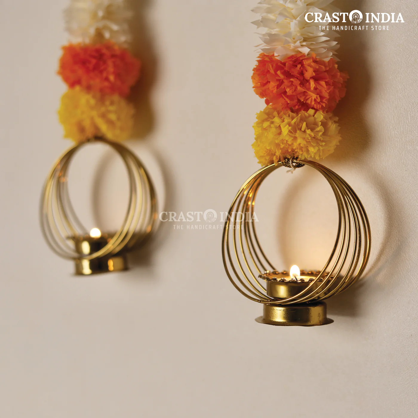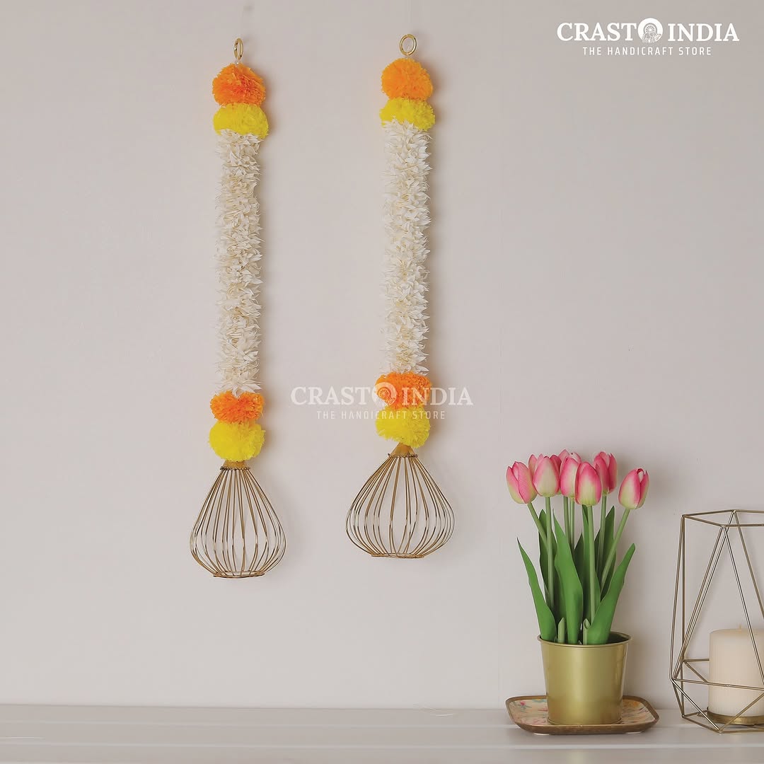 A unique yellow & white side hangingm with tea-light candle holders . A pair of 2 enhances your festive vibes.